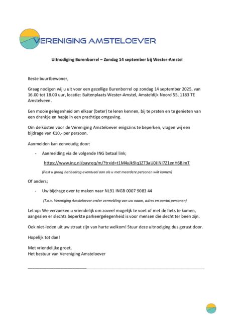 Vereniging Amsteloever-Uitnodiging Burenborrel 14 September 2025 v1.1 21 augustus 2025 Door nieuwadmin Uitnodiging Burenborrel – Zondag 14 september bij Wester-Amstel